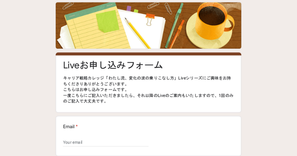 キャリア戦略カレッジ「わたし流、変化の波の乗りこなし方」Liveシリーズにご興味をお持ちくださりありがとうございます。こちらはお申し込みフォームです。一度こちらにご記入いただきましたら、それ以降のLiveのご案内もいたしますので、1回のみの...